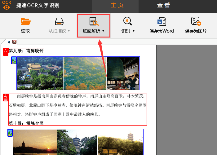 2、图片文件打开之后,点击软件上方的“纸面解析”选项,软件就会主动的解析图片里的段落文字。